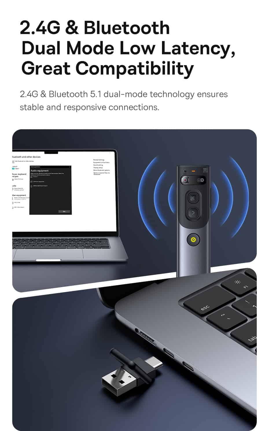 Sản phẩm sử dụng kết nối không dây 2.4GHz qua đầu thu USB hoặc Type-C, cho khả năng kết nối ổn định trong bán kính lên đến 100 mét. Baseus Orange Dot tương thích tốt với nhiều hệ điều hành như Windows, macOS, Linux và các phần mềm trình chiếu phổ biến như PowerPoint, Keynote, Google Slides. Việc cắm và sử dụng (Plug & Play) giúp tiết kiệm thời gian, không cần cài đặt phức tạp.