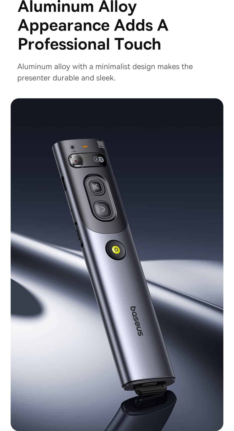 Bút trình chiếu thông minh Baseus Orange Dot AI Voice Wireless Presenter sở hữu thiết kế hiện đại với thân bút thon gọn, các đường nét tinh tế và màu sắc tối giản sang trọng. Với trọng lượng nhẹ chỉ khoảng 50g, sản phẩm dễ dàng cầm nắm và mang theo bên mình trong các buổi họp, hội thảo hay thuyết trình quan trọng. Chất liệu nhôm cao cấp giúp tăng độ bền, hạn chế bám vân tay và chống trầy xước hiệu quả.