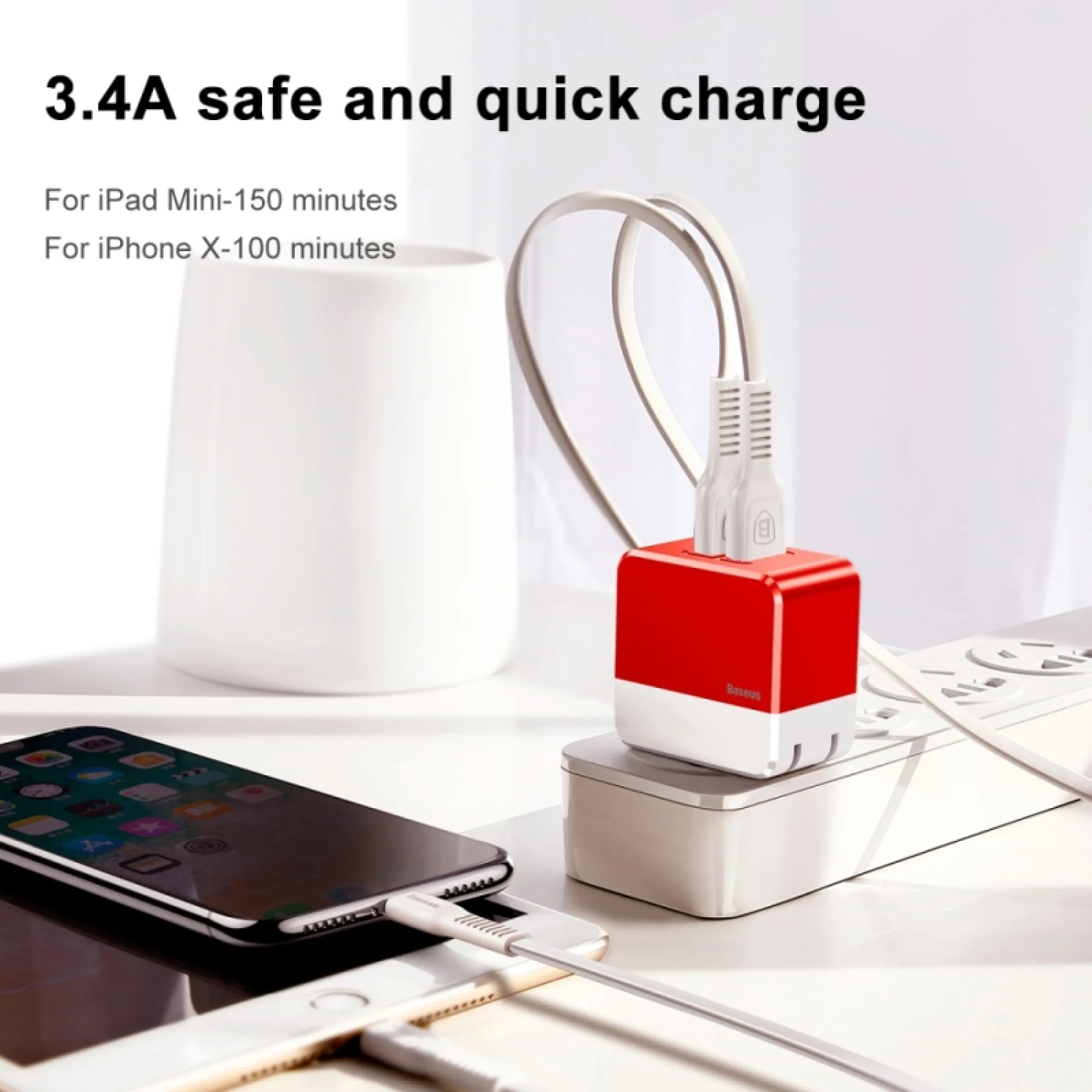 Mô tả sản phẩm Củ sạc Baseus Mini Square hỗ trợ sạc 2 thiết bị một lúc 3.4A Max cho điện thoại, máy tính bảng