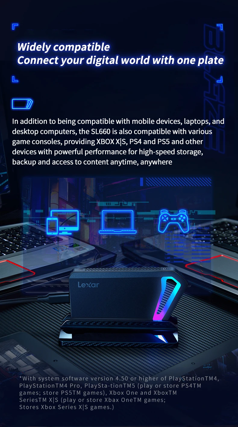 ● Ngoại hình của Lexar SL660 được trang bị LED RGB và thiết bị đế để bàn, có thể cố định Lexar SL660 với máy tính để bàn, trở thành người bạn đồng hành lý tưởng trong game của bạn và thắp sáng màn hình của bạn.