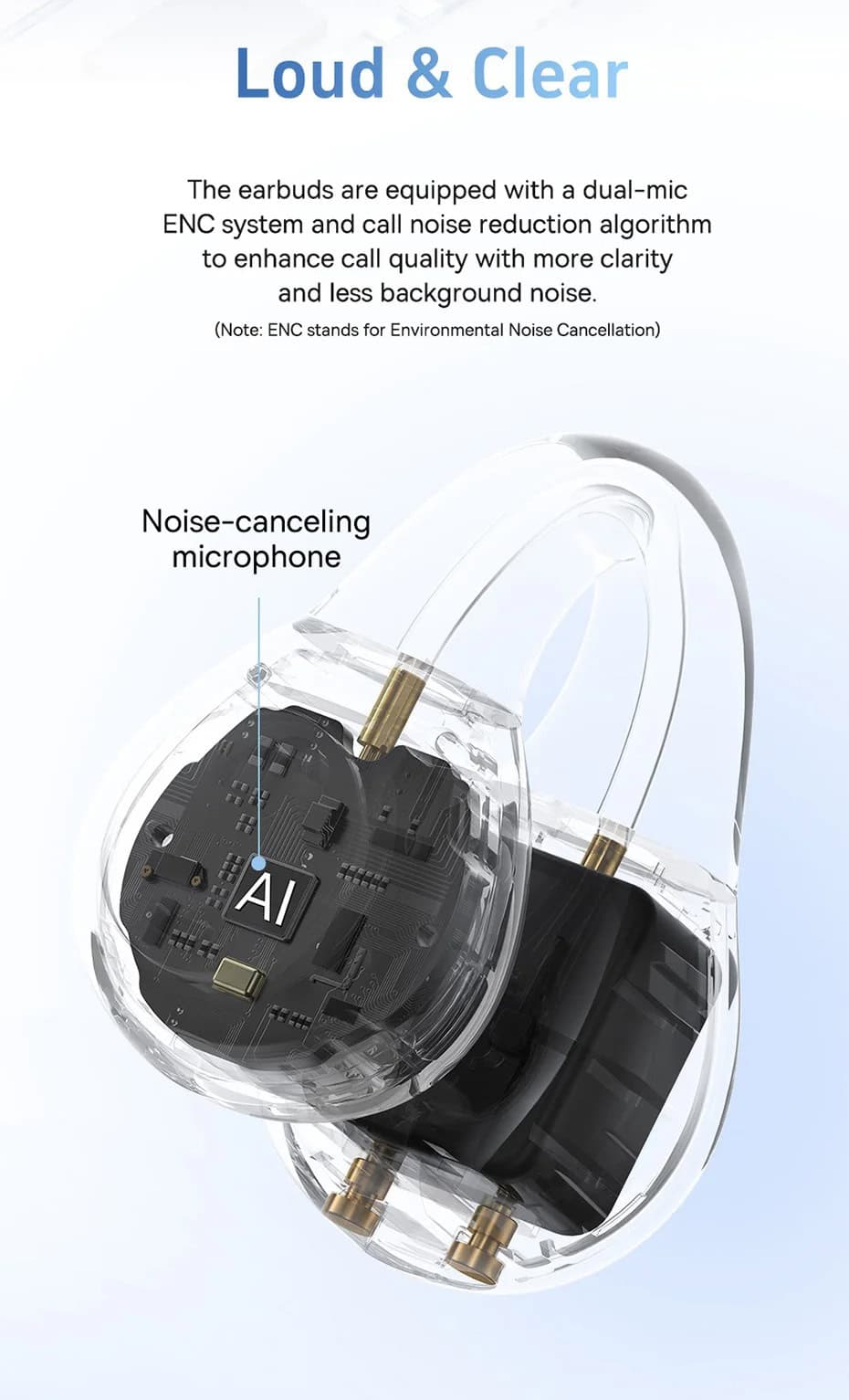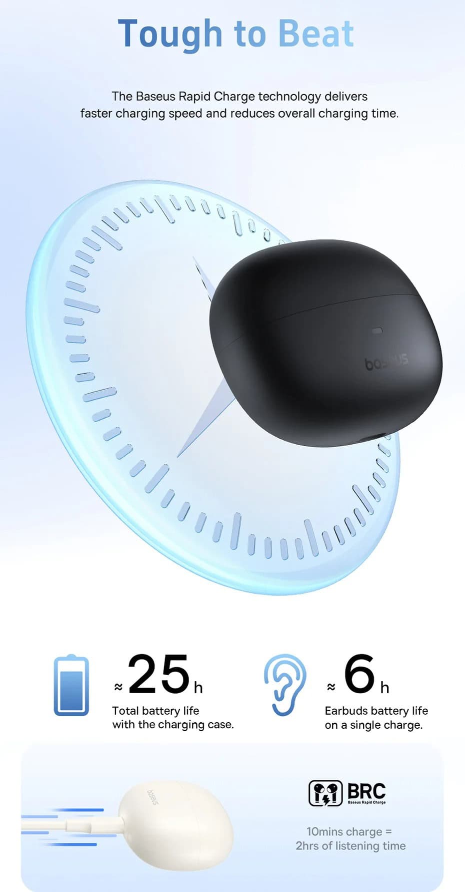 Với hệ thống 2 mic tích hợp và công nghệ ENC (Environmental Noise Cancellation), tai nghe Baseus AirGo AS01 mang lại cuộc gọi rõ ràng và mạch lạc ngay cả trong môi trường ồn ào. Bạn có thể thoải mái trò chuyện mà không cần lo lắng về tiếng ồn xung quanh.