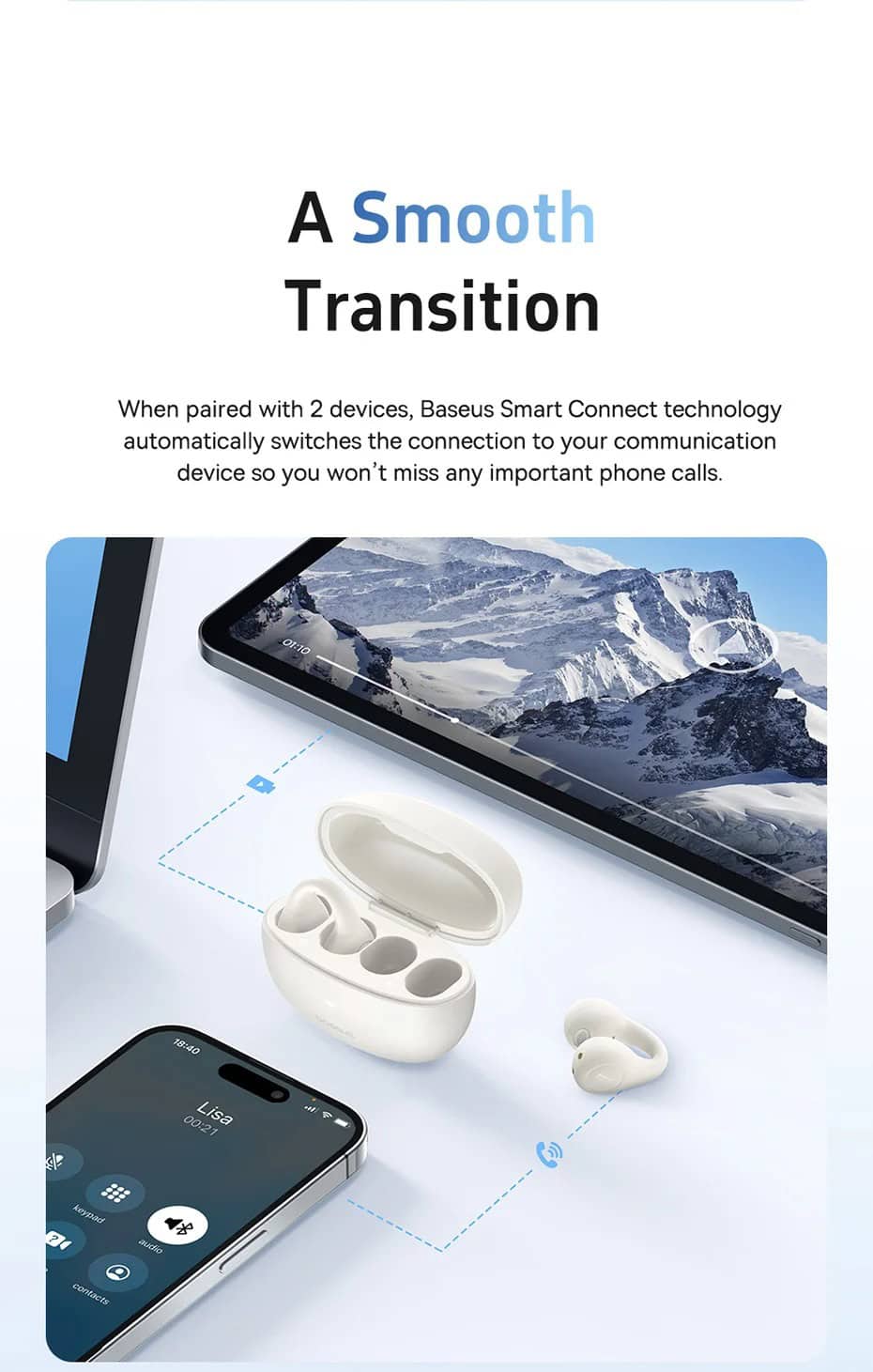 Khi kết nối với 2 thiết bị, công nghệ Baseus Smart Connect sẽ tự động chuyển kết nối đến thiết bị liên lạc của bạn để không bỏ lỡ bất kỳ cuộc gọi quan trọng nào