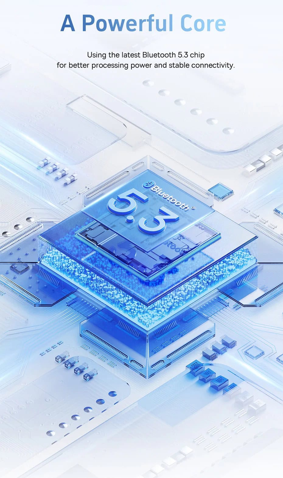 Công nghệ Bluetooth 5.3 tiên tiến giúp tối ưu hóa kết nối không dây, đảm bảo sự ổn định và độ trễ thấp, mang lại trải nghiệm nghe nhạc mượt mà và không bị gián đoạn.