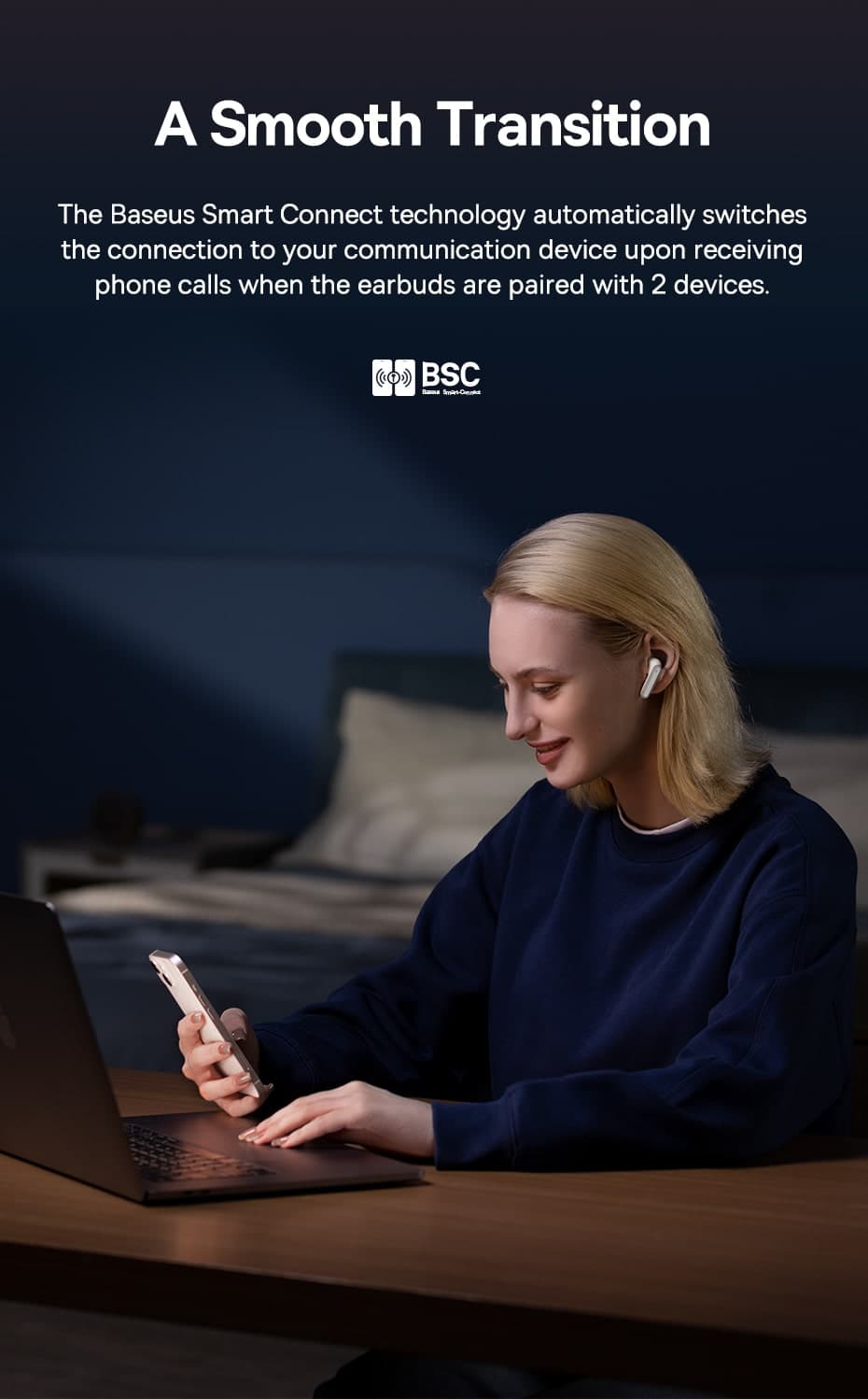 Baseus Bowie E5 là tai nghe không dây true wireless, không có dây kết nối giữa hai tai nghe, mang lại sự thoải mái và tự do cho người dùng. Sử dụng công nghệ Bluetooth 5.3 tiên tiến, giúp kết nối ổn định và hiệu quả với các thiết bị di động.